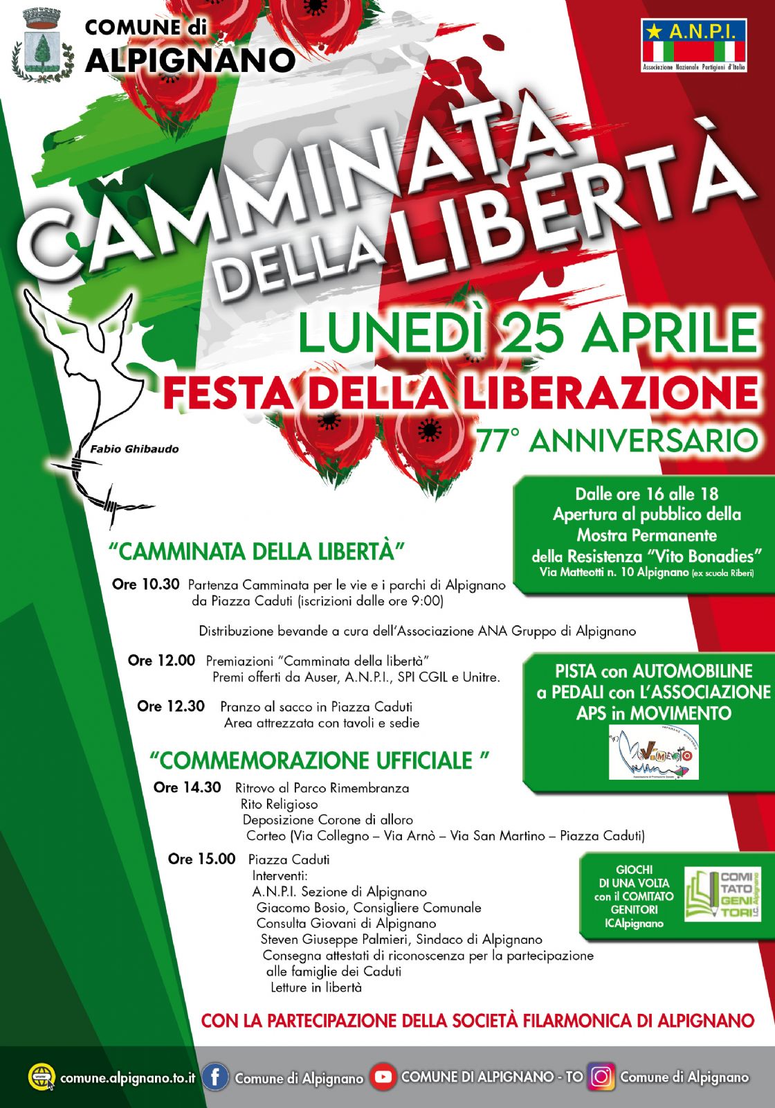 Per la Festa della Liberazione è stata organizzata una "Camminata della Libertà" per le vie e i parchi di Alpignano, aperta a tutti, SINGOLI O GRUPPI, con partenza alle ore 10.30 da piazza Caduti.