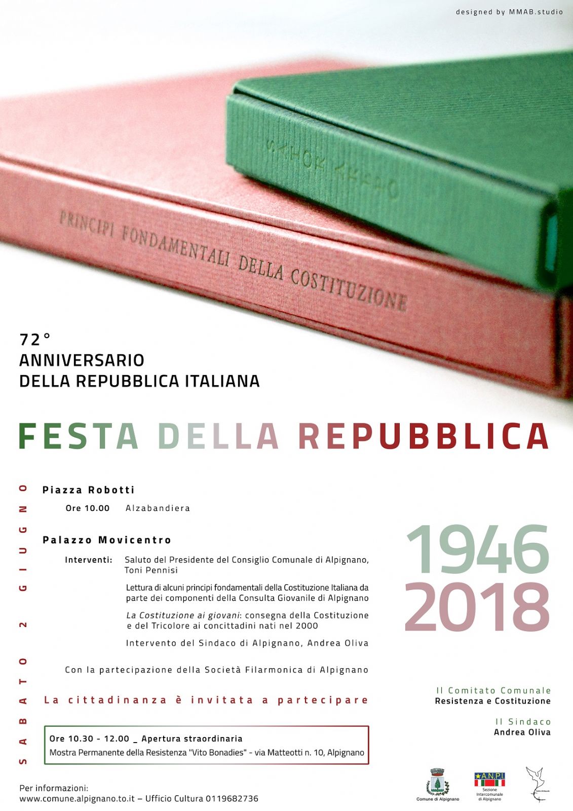 La festa della Repubblica sarà celebrata sabato 2 giugno alle ore 10.00 in piazza Robotti. La cerimonia inizierà con l'alzabandiera e proseguirà nella sala "Peppino Impastato" Palazzo Movicentro via Boneschi n. 26.