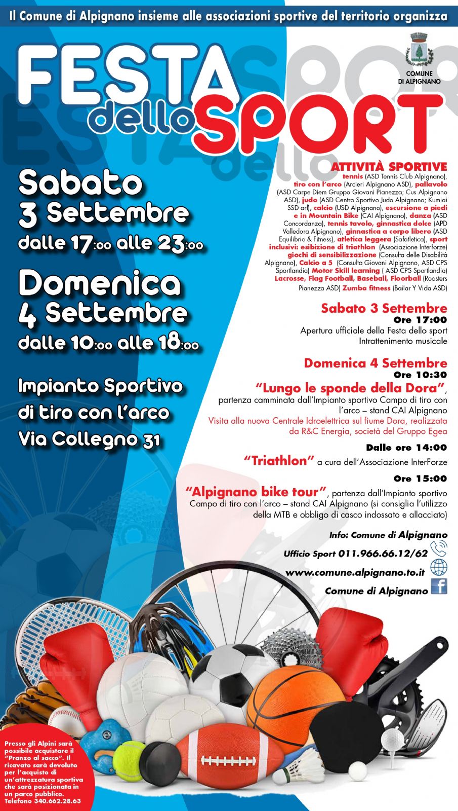 L'evento si svolgerà all'interno dell'impianto sportivo di tiro con l'arco in via Collegno n. 31, numerose le attività sportive presenti, due escursioni, in bici e a piedi, alla scoperta del nostro territorio, triathlon, gimkana a staffetta e giochi di sensibilizzazione.