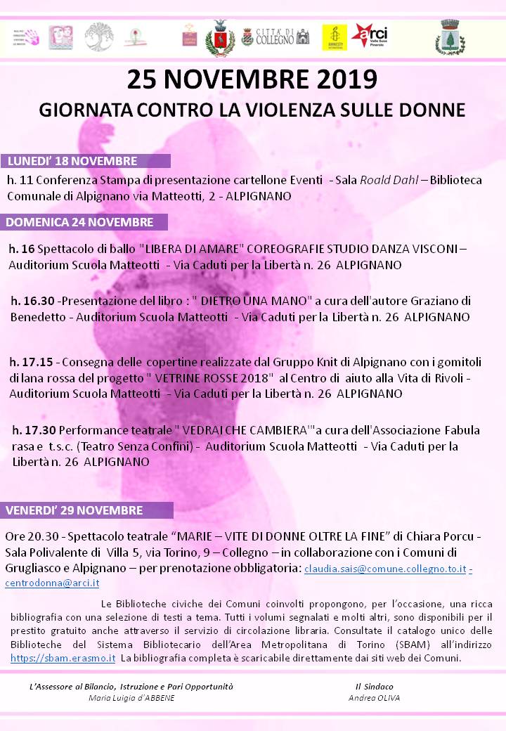 In occasione della Giornata internazionale per l'eliminazione della violenza contro le donne, istituita dall'Assemblea generale delle Nazioni Unite nel 1999, i comuni di Alpignano, Collegno, Grugliasco e Pianezza hanno scelto di lavorare in rete per organizzare iniziative finalizzate a sensibilizzare l'opinione pubblica sul tema della violenza di genere.