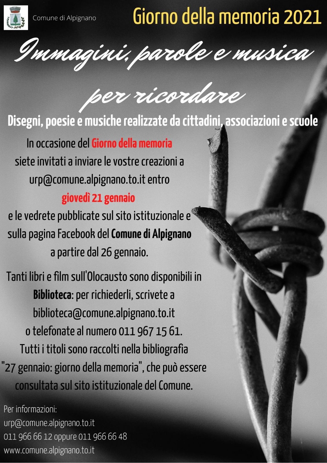 In occasione del Giorno della Memoria, siete invitati a inviare le vostre creazioni (disegni, poesie e musiche) a urp@comune.alpignano.to.it entro giovedì 21 gennaio e le vedrete pubblicate sul sito istituzionale e sulla pagina Facebook del Comune di Alpignano a partire dal 26 gennaio.