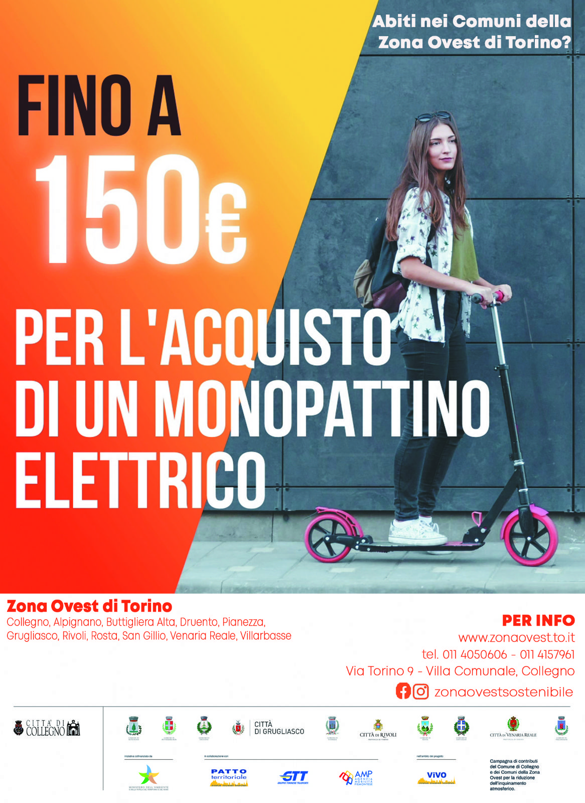 La Zona Ovest erogherà un contributo massimo di 150 euro per chi volesse acquistare monopattini elettrici ed è lavoratore o studente residente nei comuni di Alpignano, Buttigliera Alta, Collegno, Druento, Pianezza, Grugliasco, Rivoli, Rosta, Venaria Reale, Villarbasse, San Gillio.