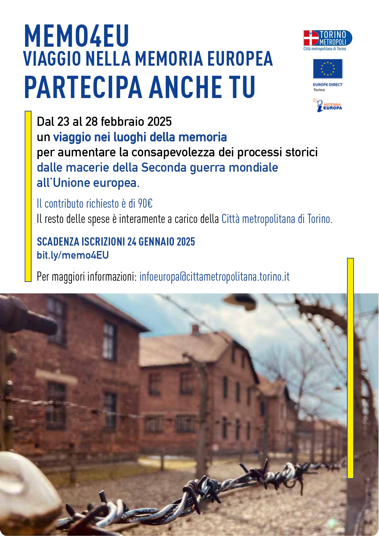 MEMO4EU è il nome dell'iniziativa, che, finanziata dalla Città metropolitana di Torino propone un Viaggio nella Memoria europea, attraverso un percorso educativo che comprende l'esperienza diretta della visita nei campi di Concentramento di Auschwitz e Birkenau, (Cracovia - PL) per conoscere la Storia e orientarsi nell'Attualità, e per abilitare e stimolare, in collaborazione con i Comuni Antenna Europa, il ruolo dei giovani quali testimoni e ambasciatori della Memoria europea nel presente.