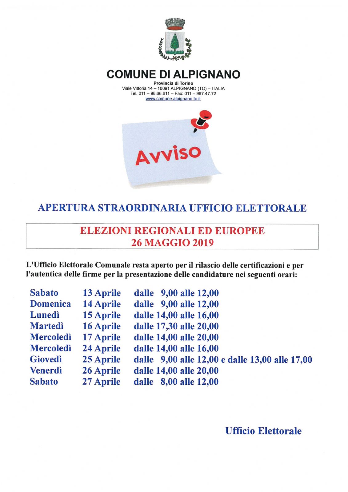 Si informa che l'ufficio elettorale comunale resta aperto ai fini degli adempimenti relativi alla presentazione delle candidature per le prossime elezioni regionali ed europee.
