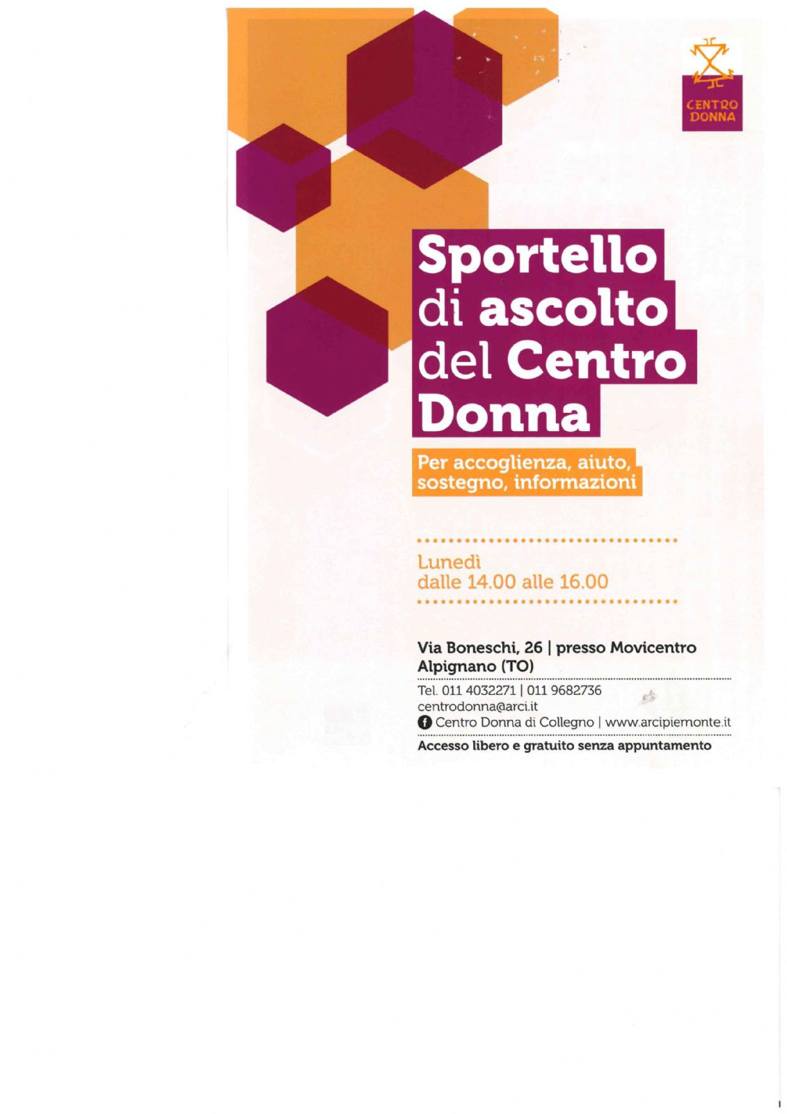 Ricordiamo che, per il mese di agosto, la sede del Centro Donna di Collegno rimarrà aperta assicurando la presenza delle operatrici nelle fasce di accoglienza o telefonicamente al numero 370/3432133.