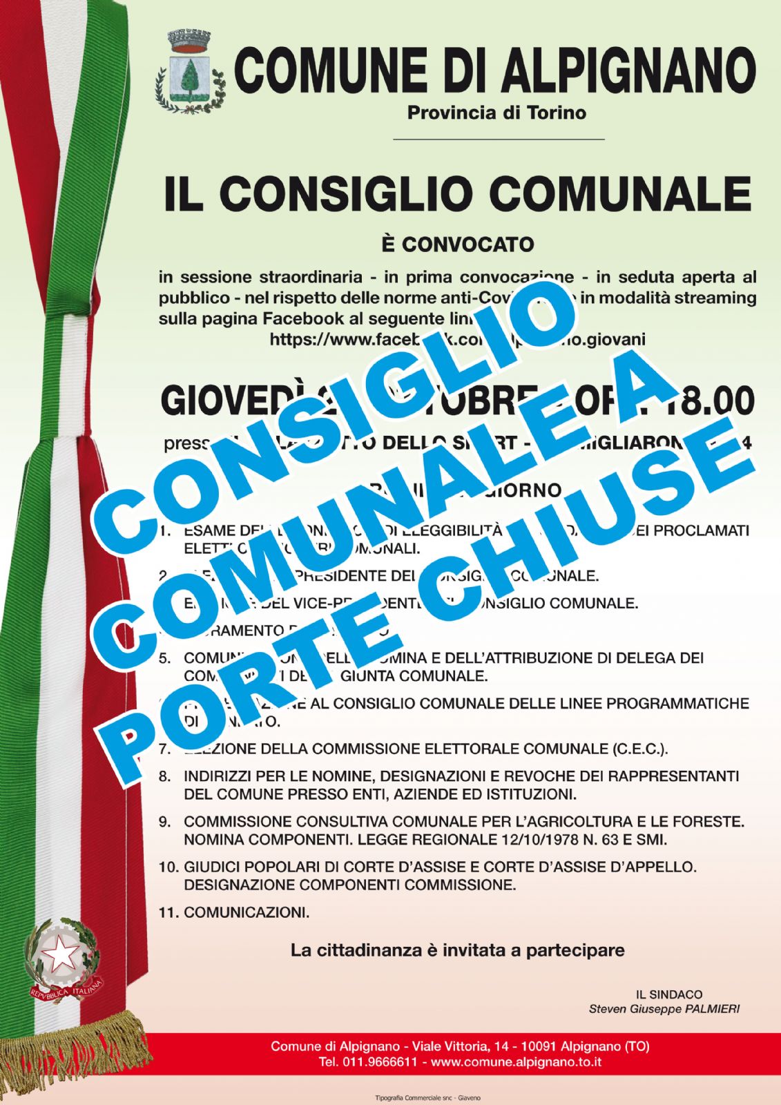 Il CONSIGLIO COMUNALE di giovedì 22 ottobre, ore 18:00, sarà A PORTE CHIUSE nel rispetto delle ultime norme anti Covid-19.