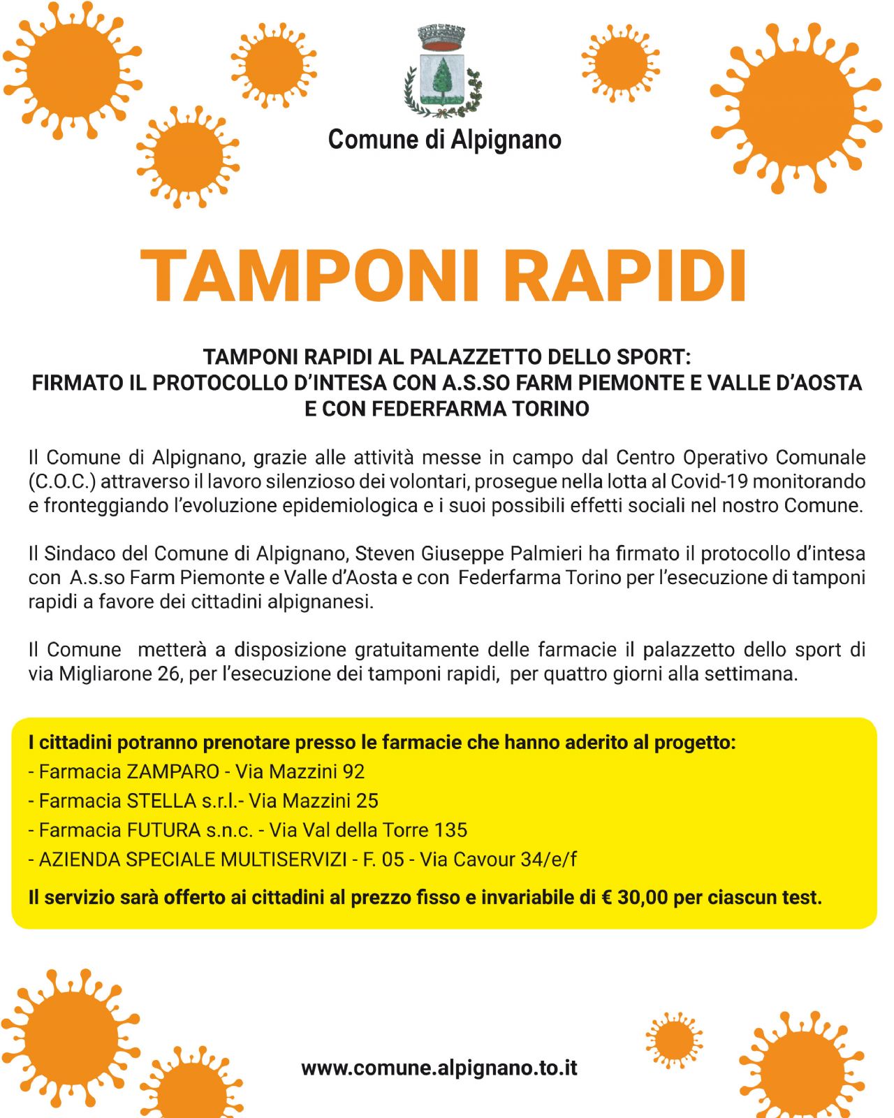 Il Sindaco del Comune di Alpignano, Steven Giuseppe Palmieri ha firmato il protocollo d'intesa con A.s.so Farm Piemonte e Valle d'Aosta e con Federfarma Torino per l'esecuzione di tamponi rapidi a favore dei cittadini alpignanesi.