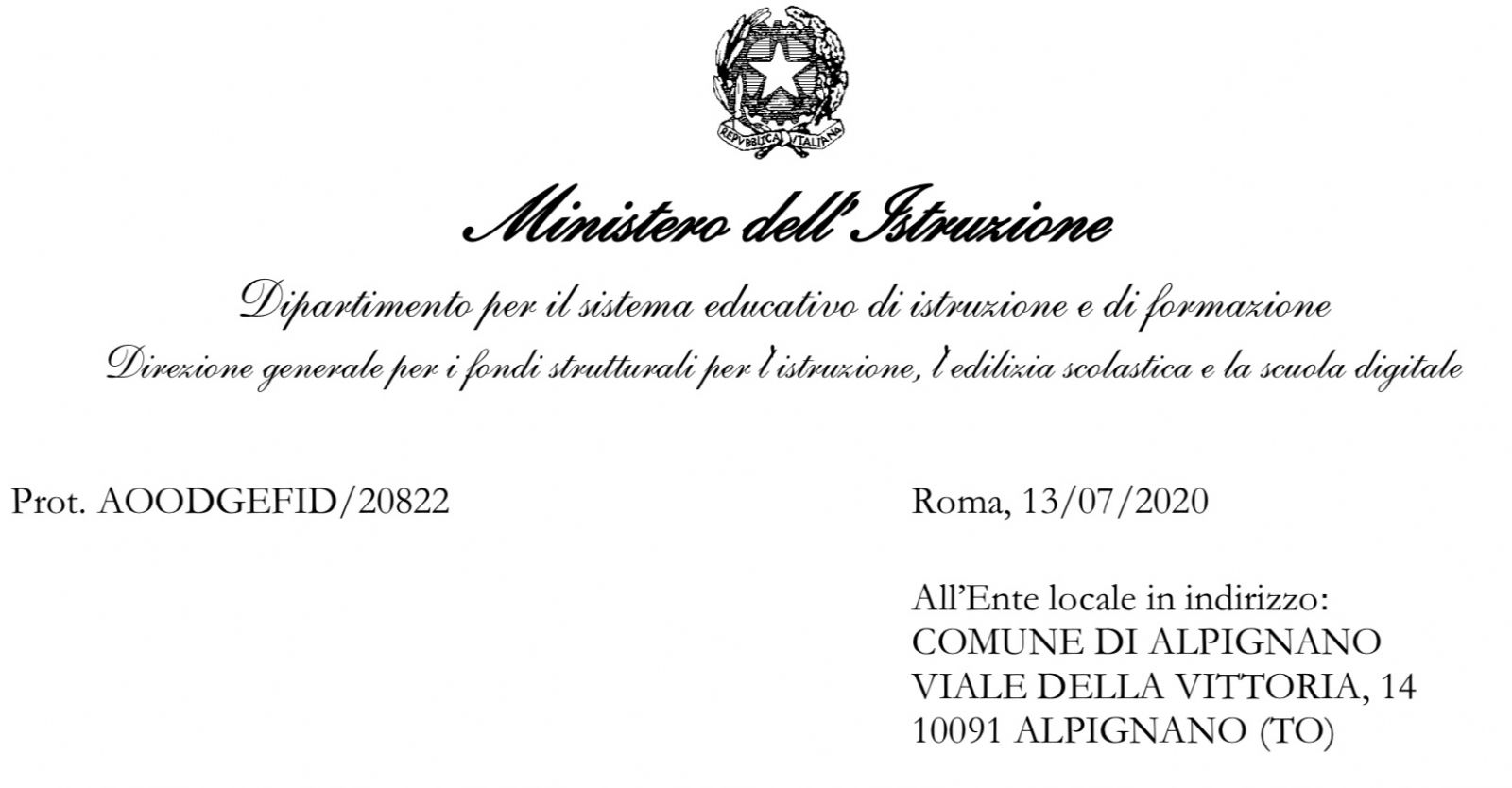 L'Ufficio Tecnico Area Lavori Pubblici informa che a seguito della presentazione della candidatura per interventi di "adeguamento e adattamento funzionale degli spazi e delle aule didattiche in conseguenza dell'emergenza sanitaria da Covid-19" il comune è stato ammesso al finanziamento di € 70.000,00 (quota parametrata per fasce alla popolazione scolastica del proprio territorio).