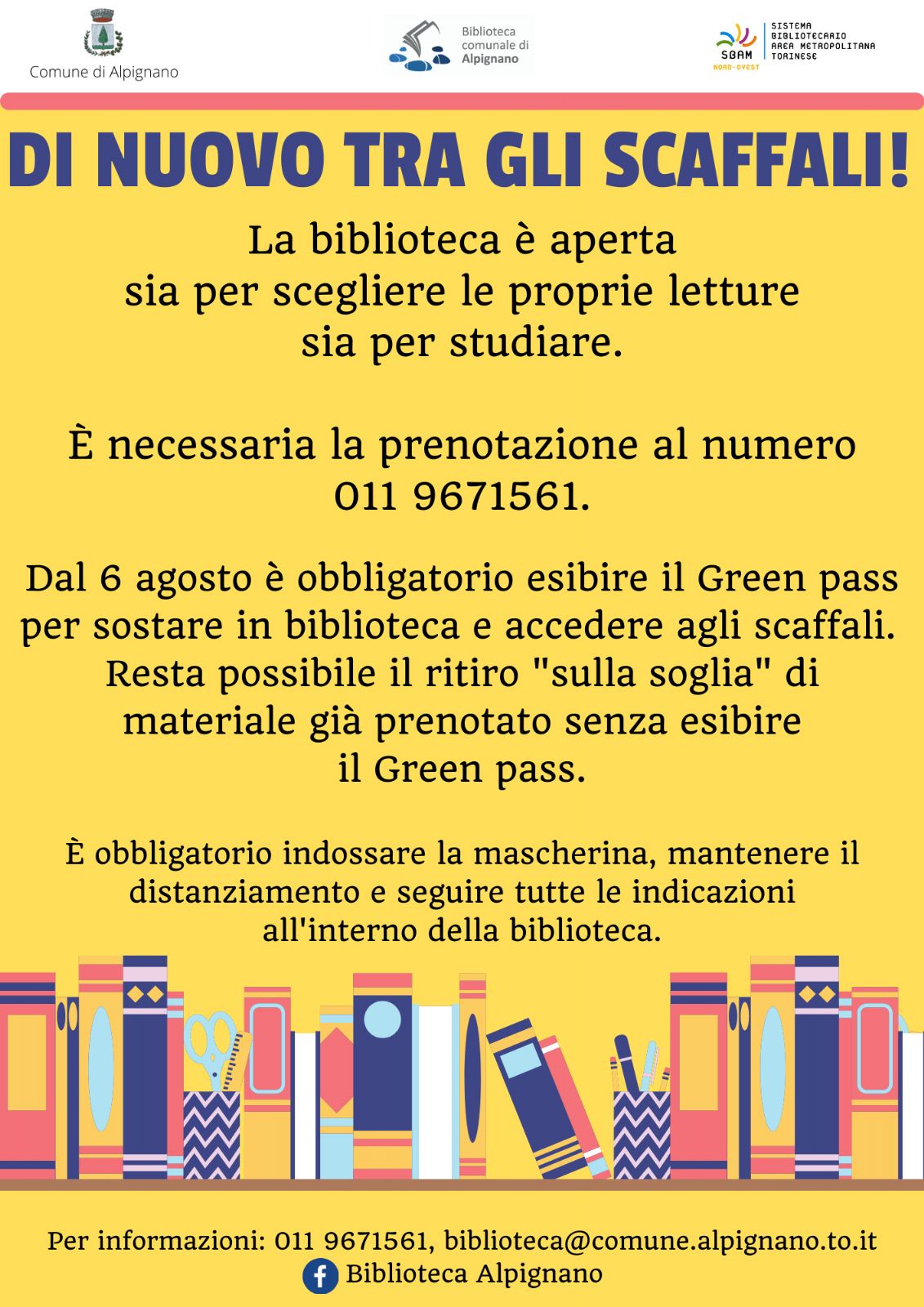 Chiunque voglia sostare in biblioteca, per scegliere le proprie letture o per studiare, quindi, dovrà esibire il Green pass; resta comunque garantita la possibilità di ritirare "sulla soglia" materiale precedentemente prenotato, anche senza essere in possesso del Green pass.