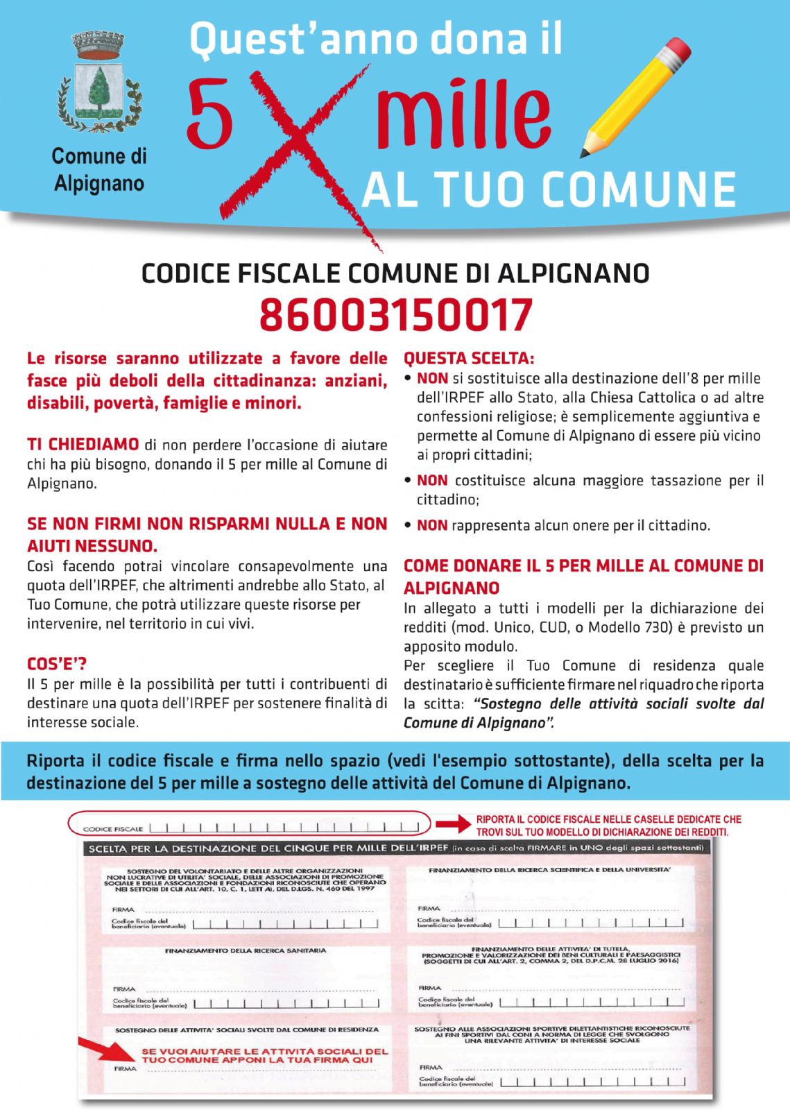 Basta una firma sulla dichiarazione dei redditi nel riquadro che riporta la scritta "Sostegno delle attività sociali svolte dal Comune di Alpignano", il 5×1000 non comporta nessun aumento di tasse e non sostituisce l’8×1000: si tratta di un’occasione importante per far rimanere immediatamente una parte delle imposte nel proprio Comune contribuendo ad aiutare le famiglie alpignanesi che ne hanno bisogno.