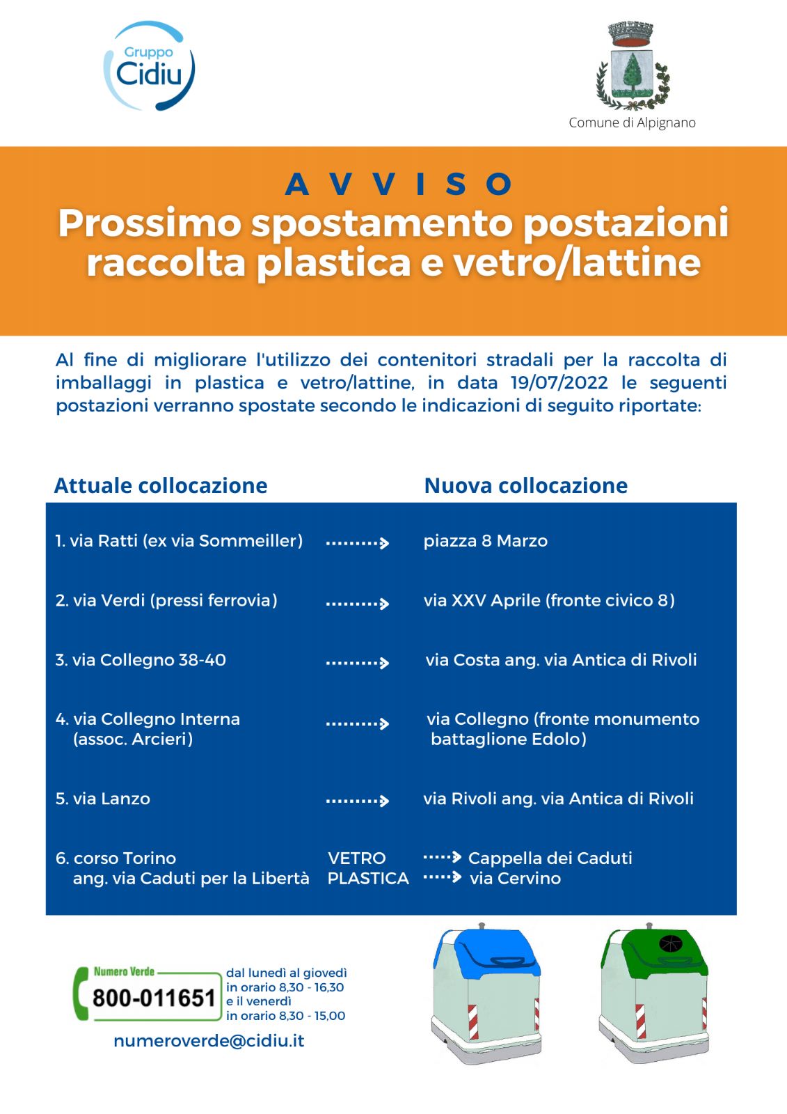 Al fine di migliorare l'utilizzo dei contenitori stradali per la raccolta di imballaggi di plastica e vetro/lattine, Gruppo Cidiu comunica che, in data 19 luglio, alcune postazioni saranno spostate secondo le indicazioni riportate sul volantino.