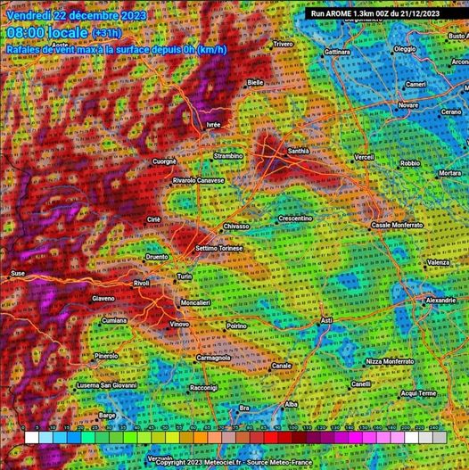 Tra la tarda sera e la notte l'alito caldo del Foehn farà irruzione anche su parte della pianura tra il Torinese e il Biellese con temperature che potranno salire fin verso i 20°C anche in piena notte, le raffiche più intense sono attese sulle pianure esposte agli sbocchi vallivi della Val Susa, Val di Lanzo e Val Chiusella dove si potrebbero raggiungere localmente gli 80/90 km/h, punte fino a 100/110 km/h nei fondovalle alpini. Seguirà un Venerdì tipicamente primaverile con ancora vento a tratti specialmente sul Piemonte occidentale e temperature massime fino a 20/22°C.