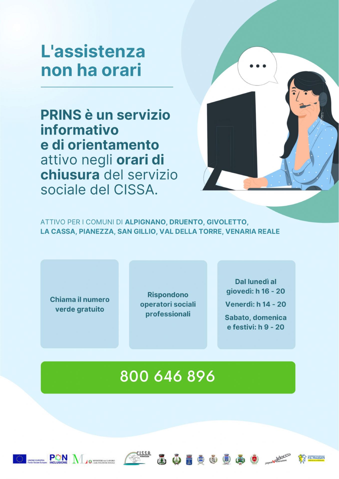 Il servizio è dedicato a fornire informazioni e orientamento in caso si necessiti di aiuto per situazioni di difficoltà negli orari in cui non è possibile rivolgersi ai servizi sociali e agli uffici.