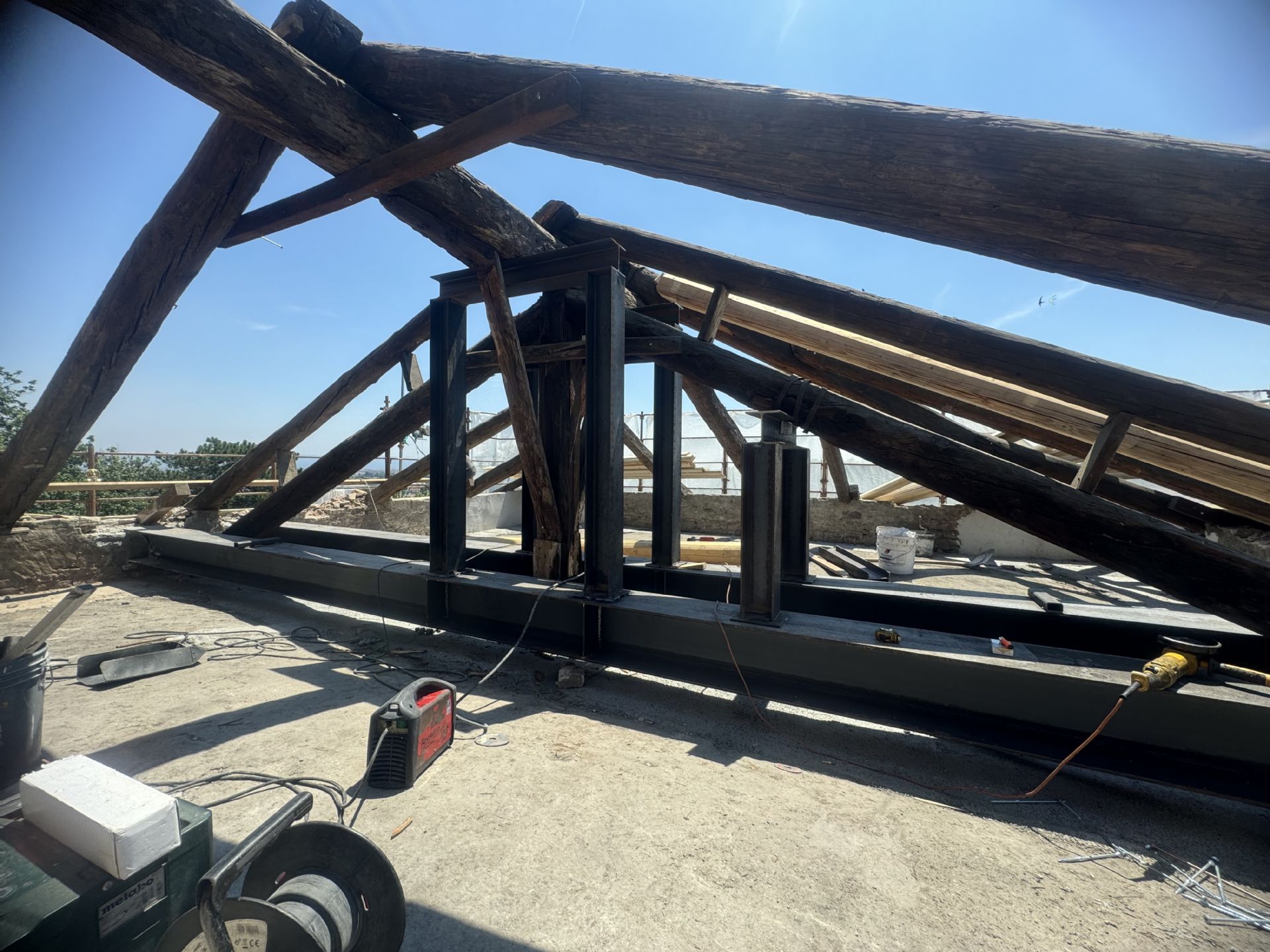 Oggi sono in corso i lavori di completamento del cavalletto metallico finalizzato al miglioramento statico locale della trave di colmo della struttura lignea della copertura.