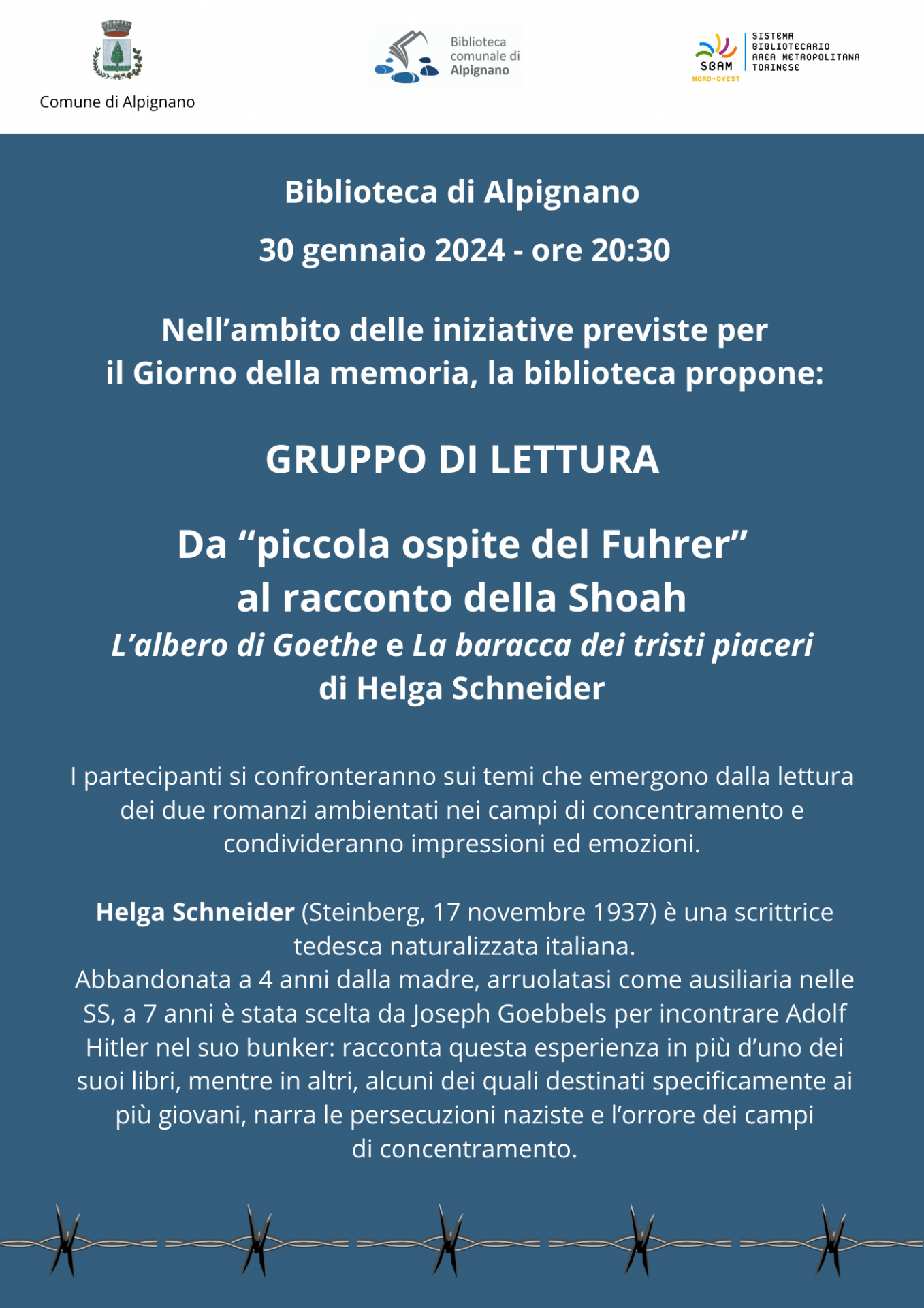 Nell'ambito delle iniziative che il Comune di Alpignano organizzerà per il Giorno della memoria, la biblioteca ha deciso di proporre un gruppo di lettura, dedicato ad approfondire il tema della Shoah attraverso la lettura di due romanzi di Helga Schneider.