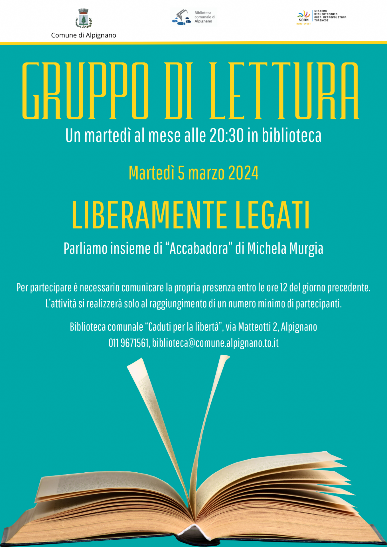 Per partecipare è necessario comunicare la propria presenza contattando la biblioteca via mail, all'indirizzo biblioteca@comune.alpignano.to.it, o telefonicamente al numero 011 9671561, entro le ore 12 del giorno che precede l'appuntamento; l'attività si realizzerà al raggiungimento di un numero minimo di partecipanti.