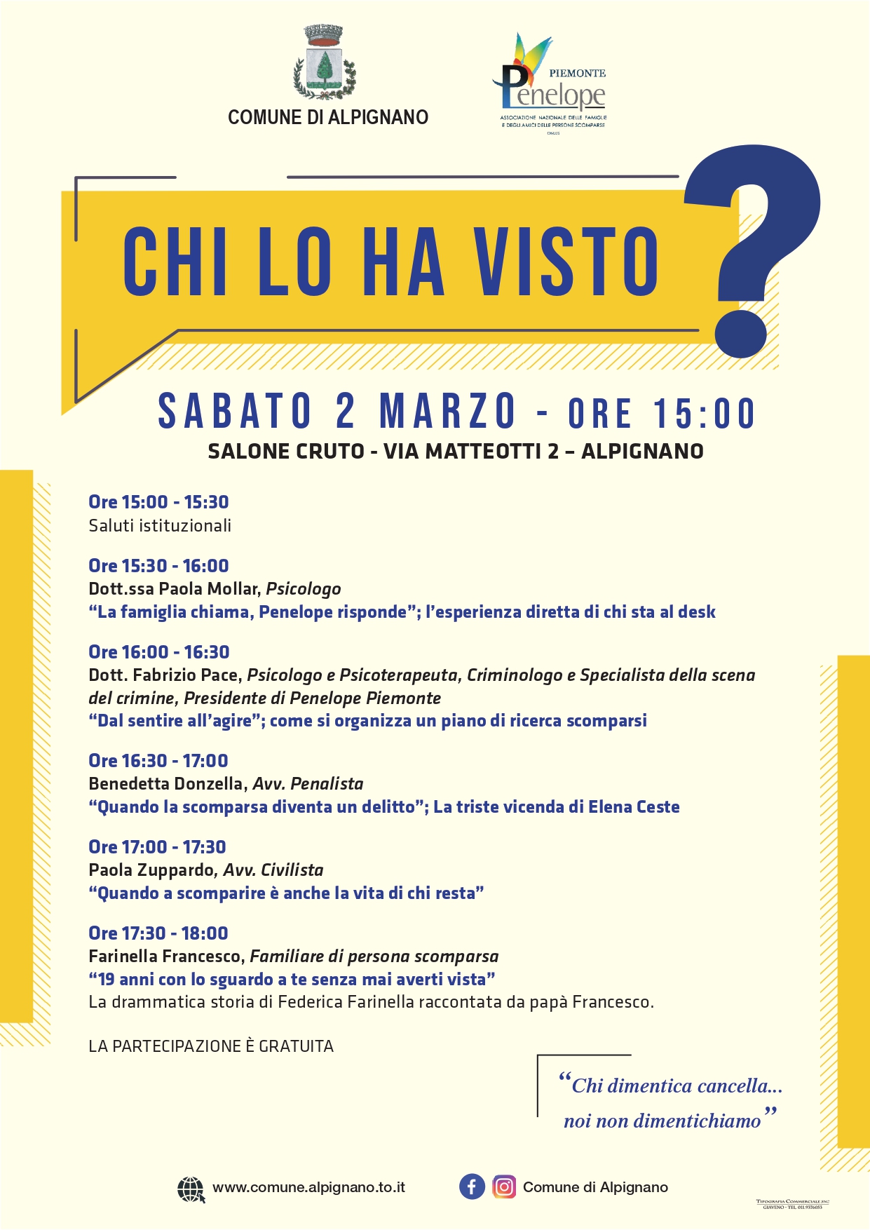 L'assessorato alla legalità del Comune di Alpignano insieme all'Associazione Penelope Piemonte, che si occupa del sostegno ai familiari di persone scomparse, intendono promuovere e sensibilizzare la cittadinanza sul fenomeno delle persone scomparse, sia dal punto di vista sociale ed economico sia da quello psicologico.