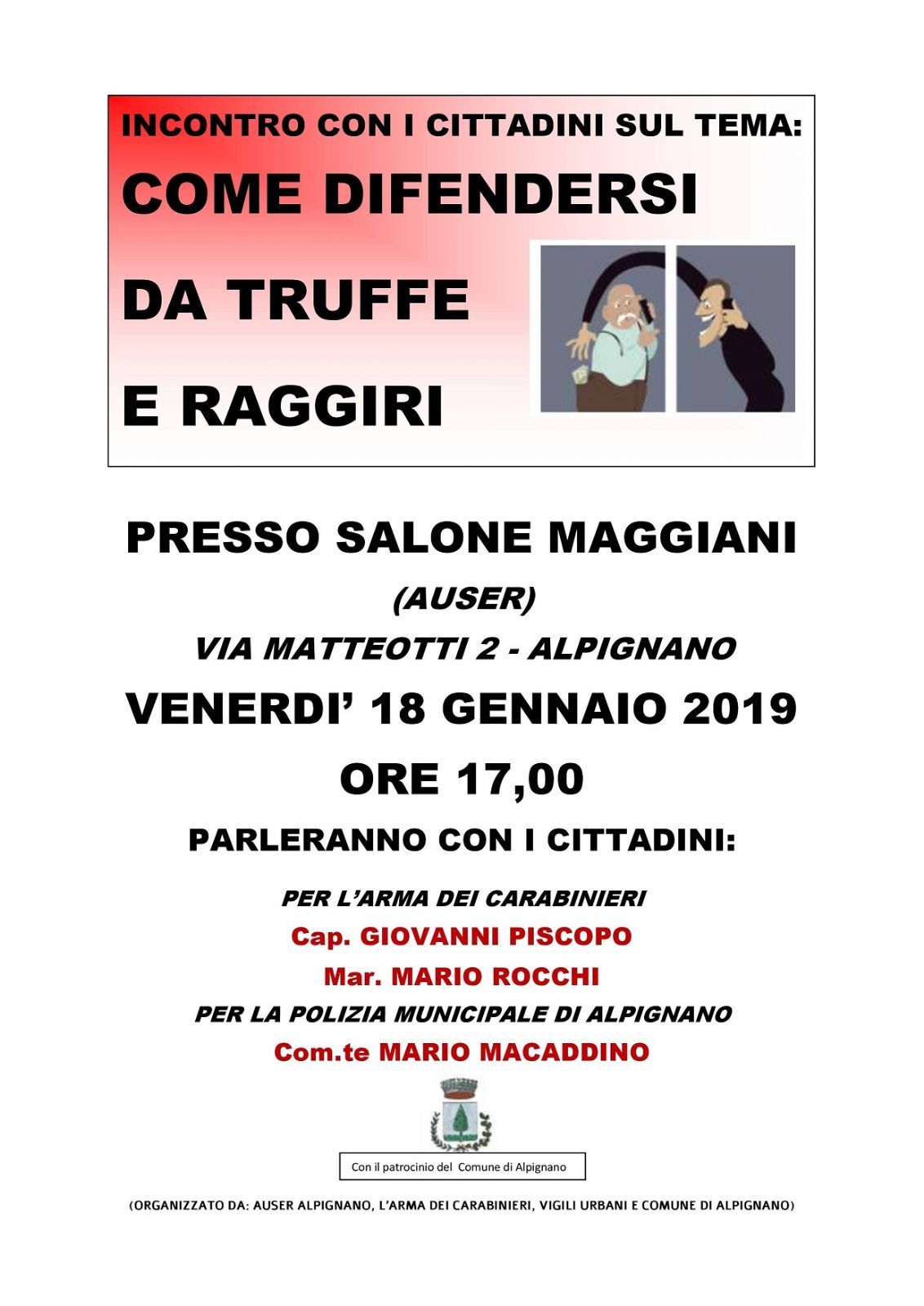 L'Associazione Auser Insieme organizza un incontro sul tema "Come difendersi da truffe e raggiri" venerdì 18 gennaio alle ore 17.00 presso il Centro d'Incontro Dino Maggiani, via Matteotti n. 2.