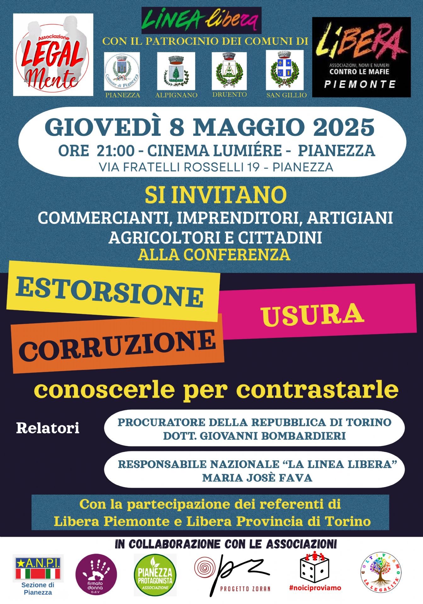 Conferenza "Estorsione, corruzione, usura: conoscerle per contrastarle", giovedì 8 maggio 2025, ore 21:00 presso il Cinema Lumiére di Pianezza.