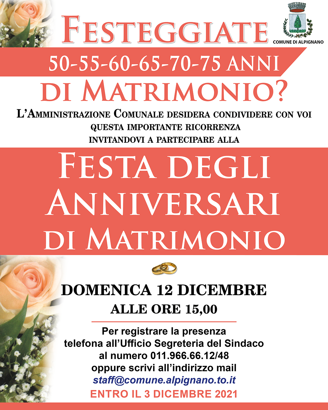 Vi Invitiamo a comunicare la presenza telefonando all'Ufficio Segreteria del Sindaco al numero 011.966.66.12/48 o scrivendo all'indirizzo mail staff@comune.alpignano.to.it entro il 3 dicembre.