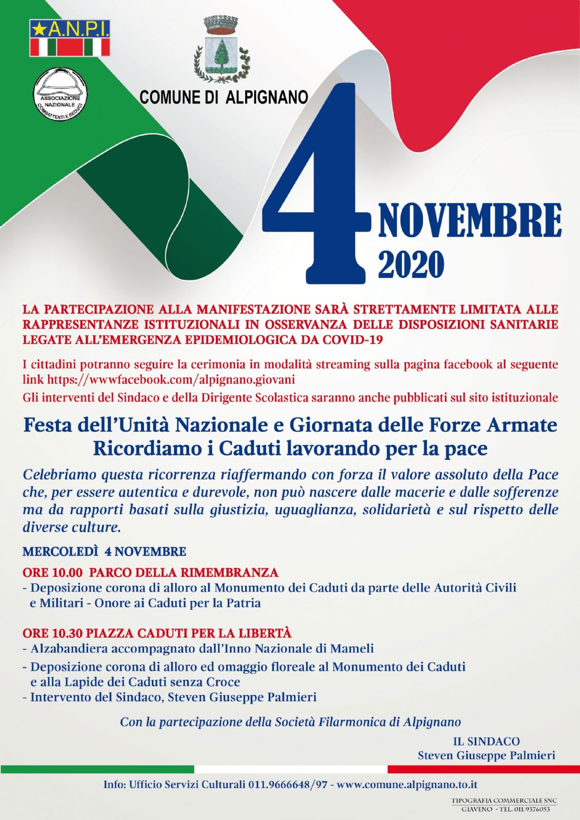 Il Sindaco provvederà, a nome di tutti gli alpignanesi, a deporre le corone di alloro presso il monumento ai Caduti nel Parco della Rimembranza, la Cappella dei Caduti e l'omaggio floreale alla Lapide dei Caduti senza Croce.