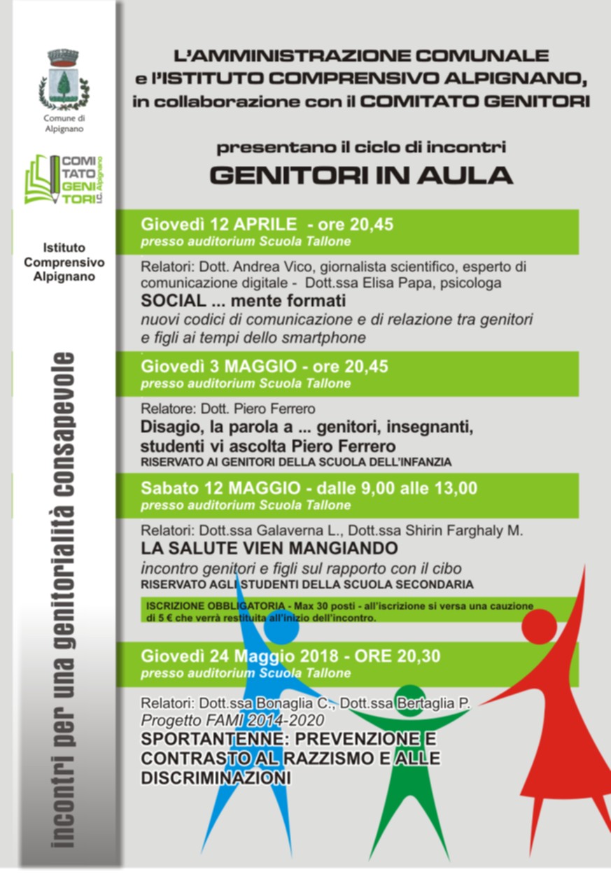 L'Amministrazione Comunale e l'Istituto Comprensivo di Alpignano in collaborazione con il Comitato Genitori ICAlpignano presentano l'iniziativa "Genitori in aula", un ciclo di conferenze e attività educative presso l'auditorium della Scuola Tallone.