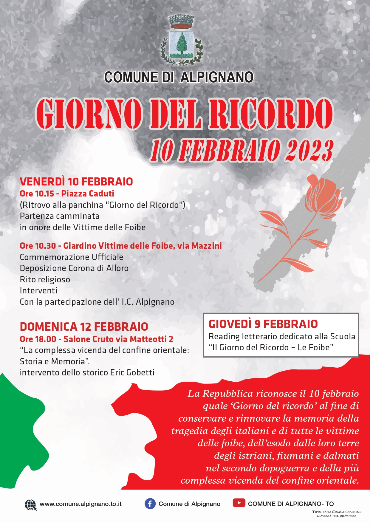 - Venerdì 10 febbraio, ore 10.15, presso la panchina dedicata in Piazza Caduti, partenza della camminata in onore delle Vittime delle Foibe e arrivo al giardino a loro intitolato in via Mazzini, dove si svolgerà la Commemorazione Ufficiale, la deposizione della corona di alloro, il rito religioso e alcuni interventi.