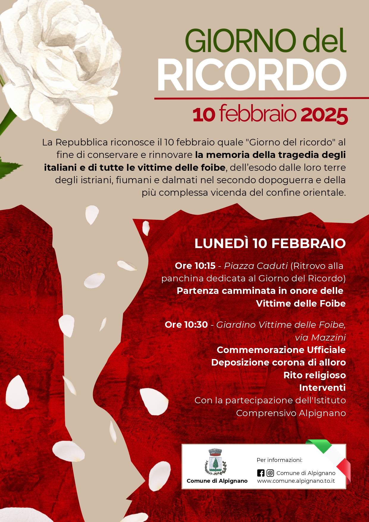 Lunedì 10 febbraio, ore 10:15, ritrovo presso la panchina dedicata al "Giorno del Ricordo" in Piazza Caduti e camminata in onore delle Vittime delle Foibe con arrivo nell'area verde di via Mazzini, angolo via Marconi dove è situato il cippo a loro dedicato.