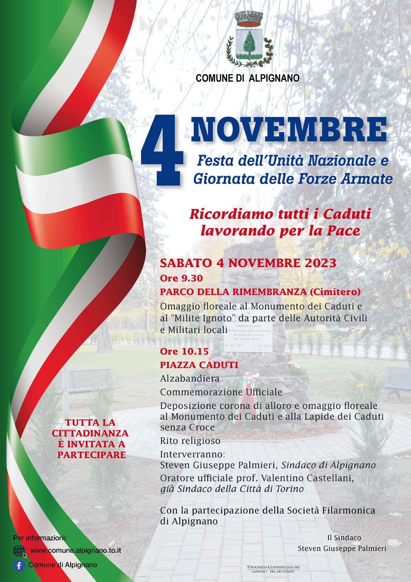 alzabandiera, onori ai Caduti, rito religioso a cura del Parroco della Parrocchia San Martino Vescovo Don Pierantonio Garbiglia, intervento del Sindaco e dell'oratore ufficiale prof. Valentino Castellani, già Sindaco della Città di Torino.