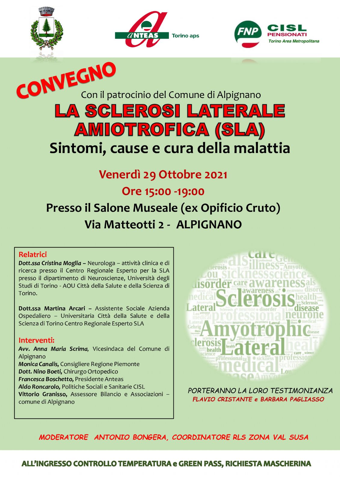 La Cisl FNP Pensionati, con il patrocinio del Comune di Alpignano, organizza un convegno sulla Sclerosi Laterale Amiotrofica (SLA) venerdì 29 ottobre, alle ore 15.00, presso il Salone Cruto, via Matteotti 2 Alpignano.