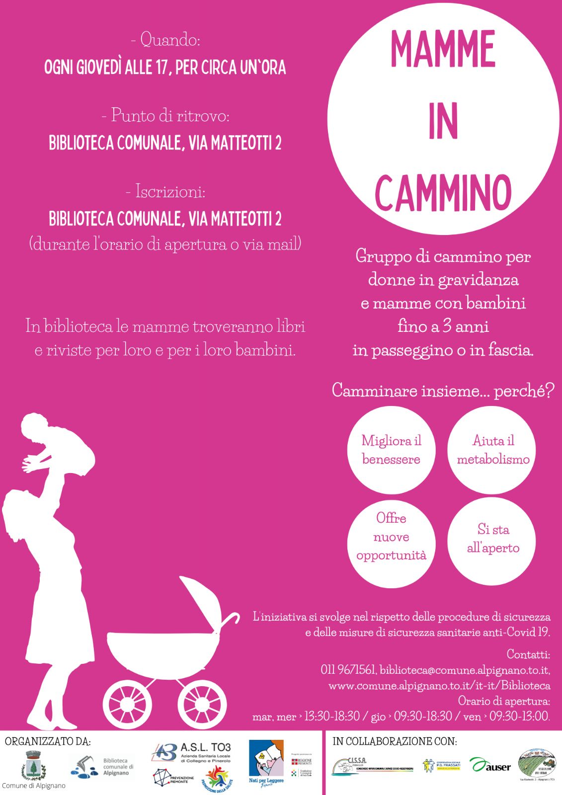 Riparte il progetto Mamme in cammino, gruppo di cammino per donne in gravidanza e mamme con bambini fino a tre anni, portati in passeggino o in fascia; l’iniziativa è realizzata dalla biblioteca di Alpignano su proposta della Struttura Semplice Promozione della Salute facente capo all’ASL TO3.