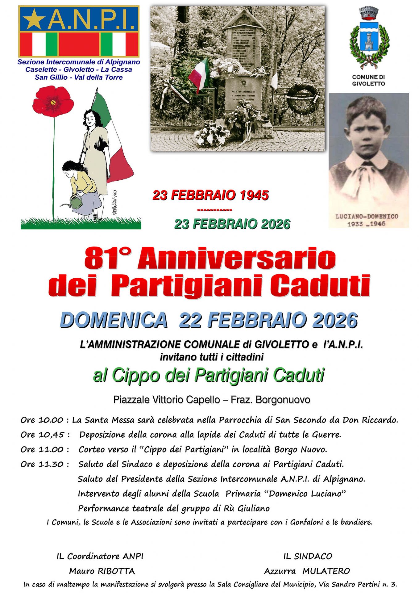 L’Amministrazione Comunale di Givoletto e la Sezione Intercomunale A.N.P.I. di Alpignano invitano la cittadinanza a partecipare alla commemorazione dell’81° Anniversario dei Partigiani Caduti, in programma domenica 22 febbraio 2026 presso il Cippo dei Partigiani Caduti in Piazzale Vittorio Capello, Frazione Borgonuovo.