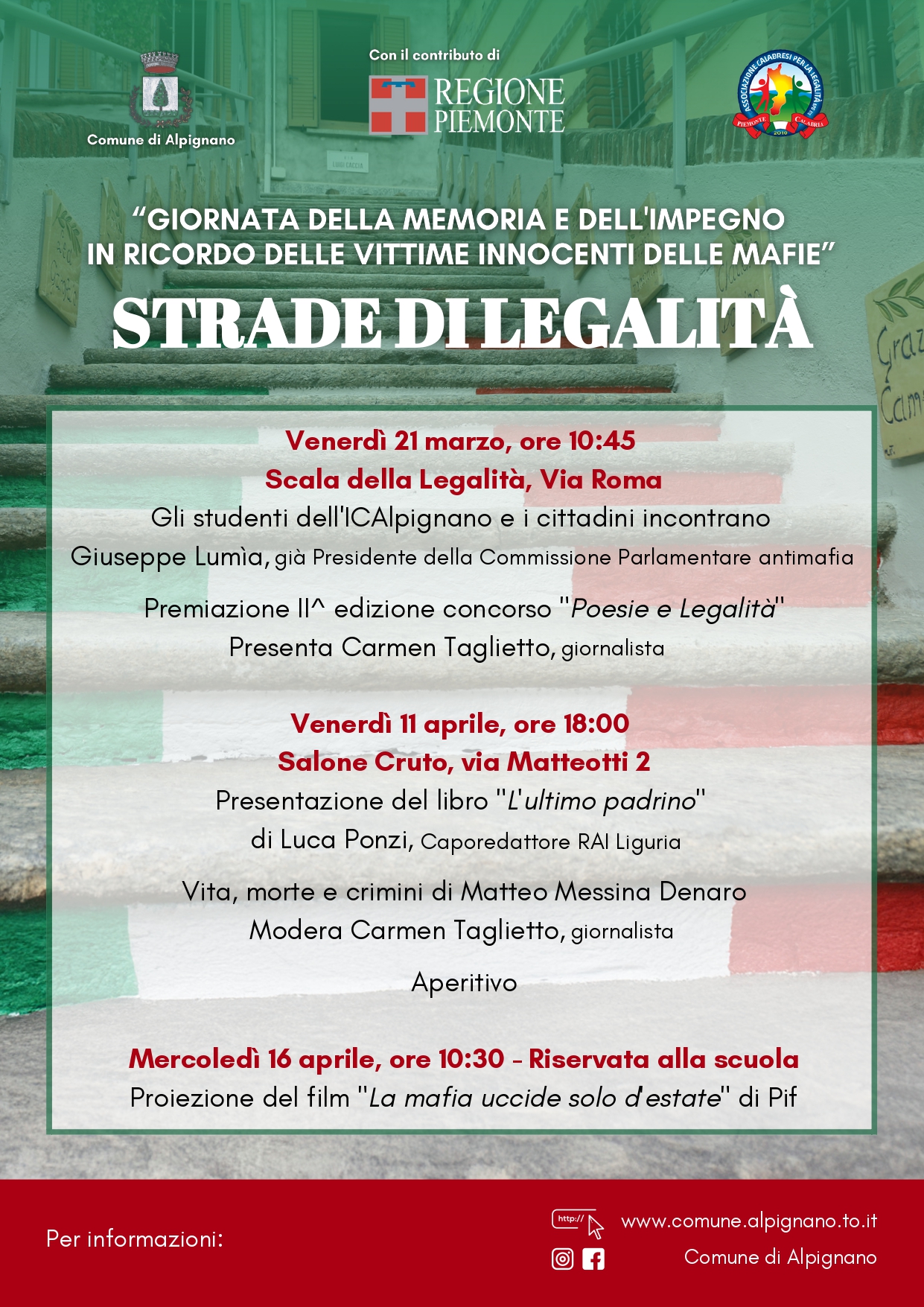 L'Amministrazione Comunale di Alpignano e l'Associazione Calabresi per la legalità, con il contributo della Regione Piemonte, in continuità con quanto avviato gli anni scorsi, proseguono nella promozione dei valori di Legalità e Giustizia attraverso l''iniziativa “Strade di Legalità”.