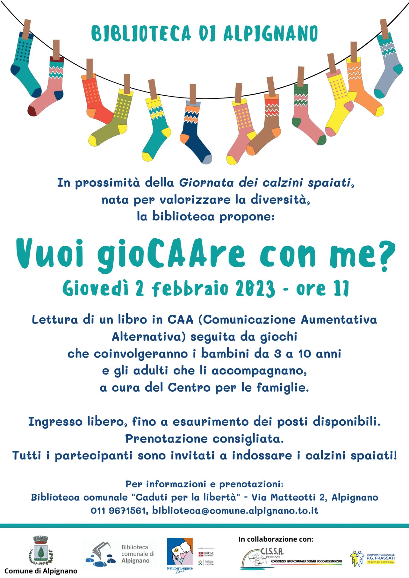 In prossimità della Giornata dei calzini spaiati, nata per valorizzare la diversità, giovedì 2 febbraio alle ore 17 la biblioteca propone l’iniziativa dal titolo “Vuoi gioCAAre con me?”, a cura del Centro per le famiglie.