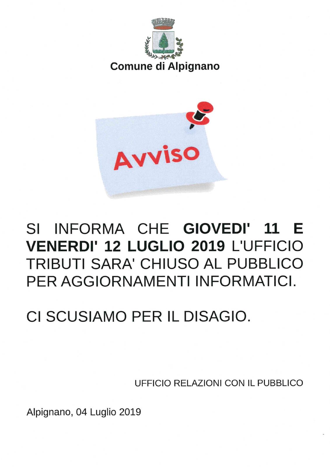 SI INFORMA CHE GIOVEDI' 11 E VENERDI' 12 LUGLIO L'UFFICIO TRIBUTI SARA' CHIUSO PER AGGIORNAMENTI INFORMATICI.