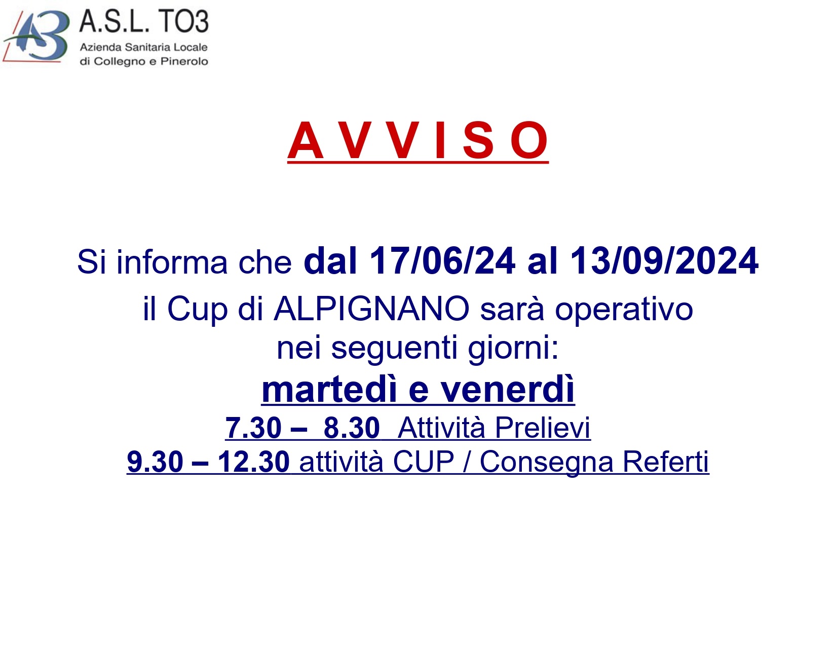 Si informa che dal 17/06/24 al 13/09/2024 il Cup di ALPIGNANO sarà operativo nei seguenti giorni:
