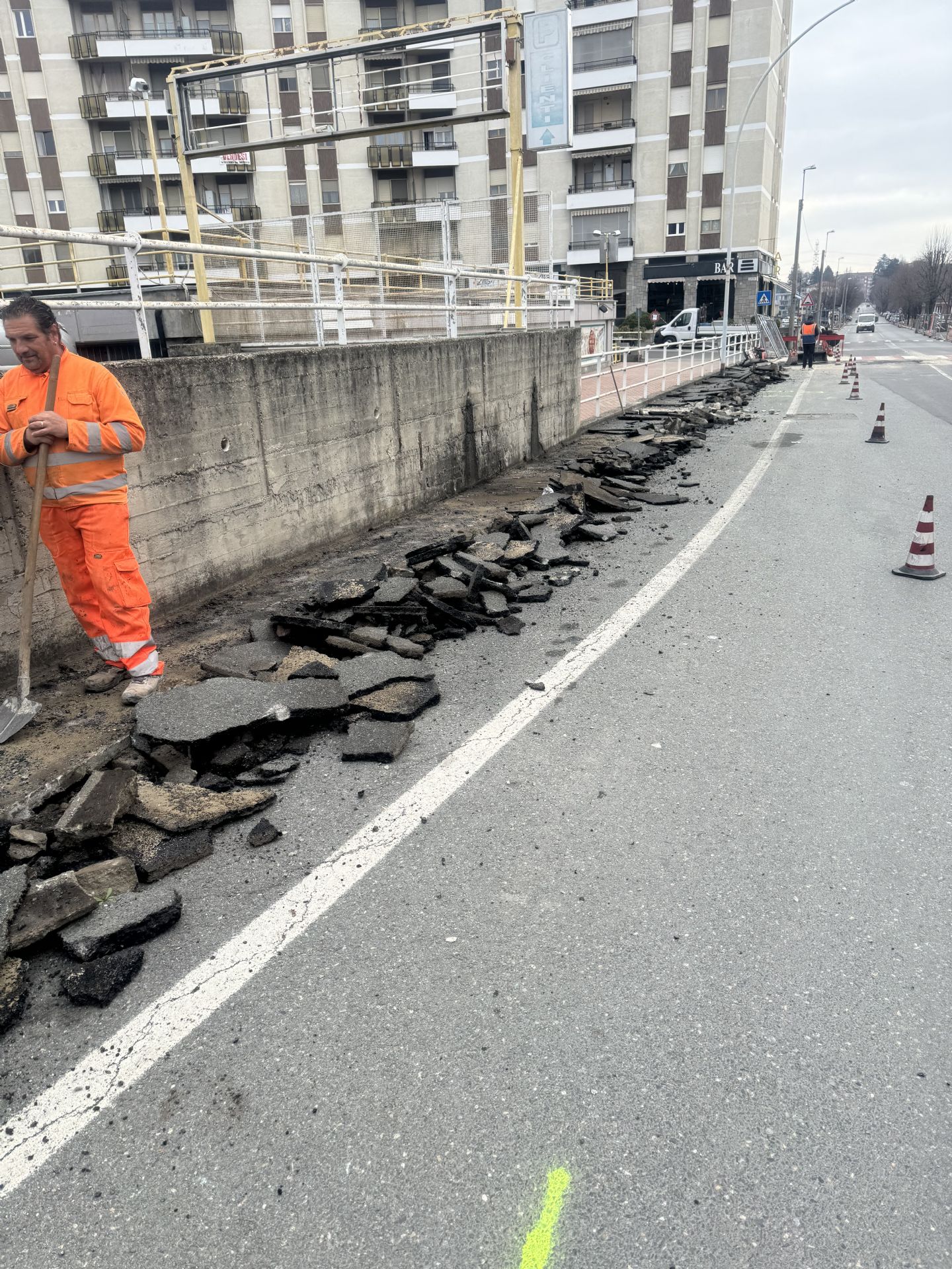 Sono in corso i lavori di scarifica dell'asfalto e della rimozione del cordolo ammalorato del marciapiede di via Cavour lato sinistro