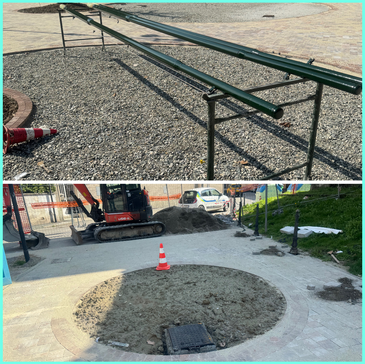 Oggi sono in corso i lavori di completamento della pavimentazione della piazza lato via San Martino e della verniciatura dei pennoni porta bandiere.