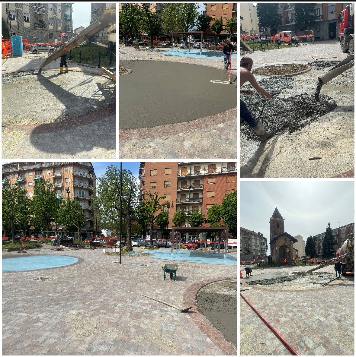 Oggi sono in corso le operazioni di getto del cemento lavato di rifinitura delle isole centrali.