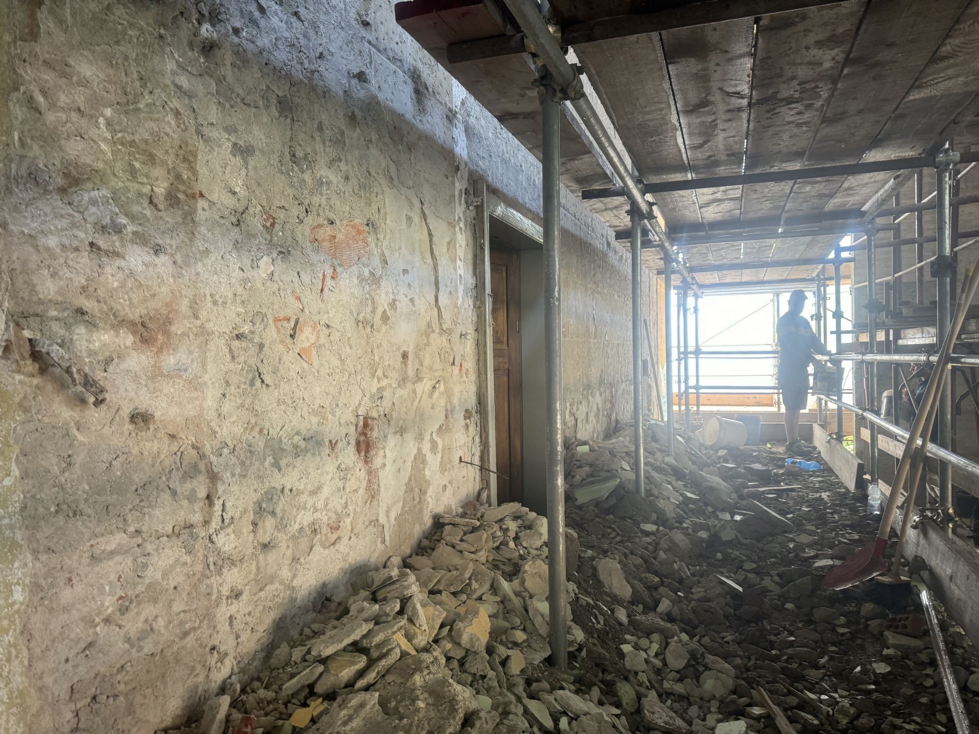 Sono in corso le operazioni di rimozione dello strato d'intonaco superficiale sintetico visibile fino ad arrivare allo strato del mattone bugnato riportando alla luce il prospetto originale dell'edificio storico lato ovest.