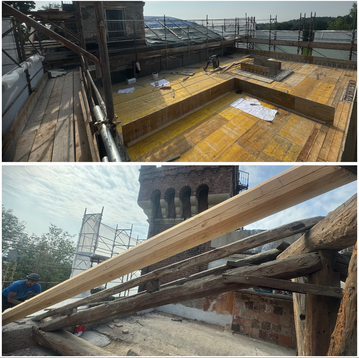 - posa puntoni mancanti in legno della struttura a capriata della copertura. La capriata ha il vantaggio di annullare le spinte orizzontali grazie alla sua struttura triangolare.