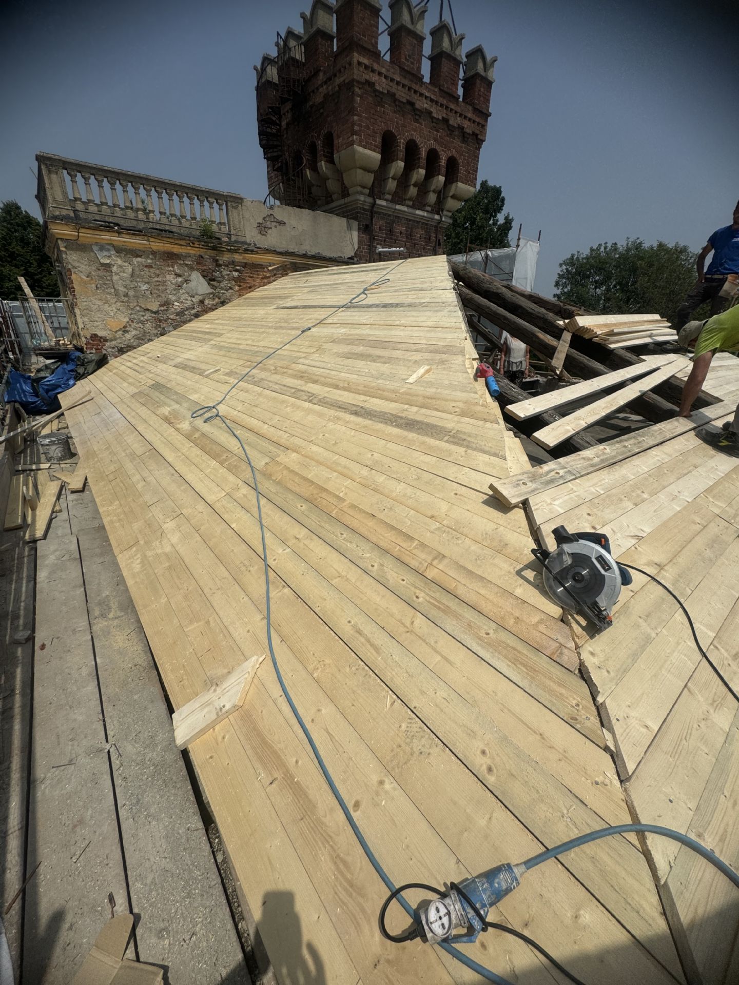 Oggi sono in corso i lavori di posa del tavolato ligneo ancorato all'estradosso dei puntoni della struttura a capriata della copertura lato sud. Questa soluzione permette di garantire una maggior rigidezza alla struttura.