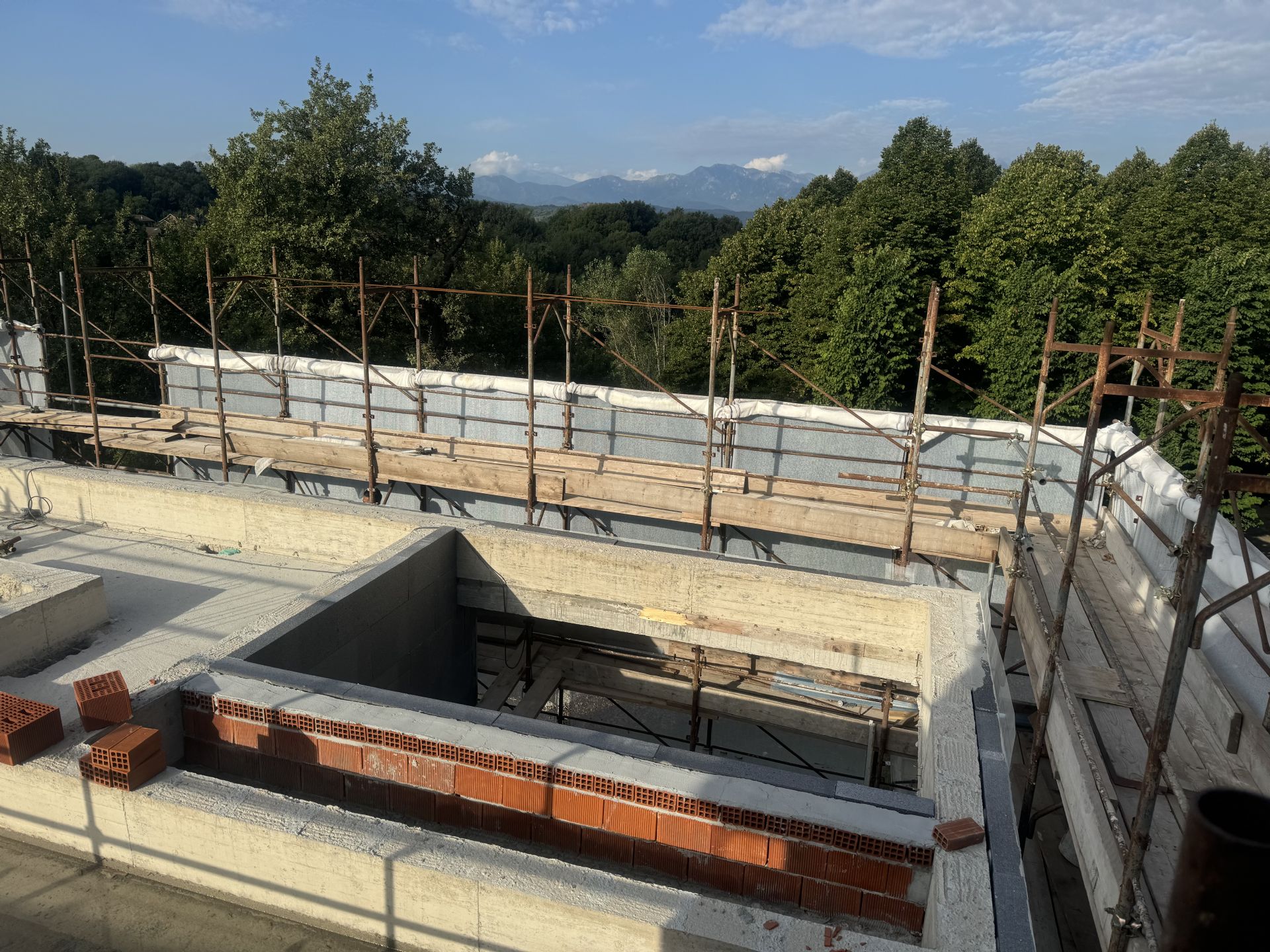 Oggi sono in corso i lavori di rasatura del cappotto termico esterno del nuovo edificio.