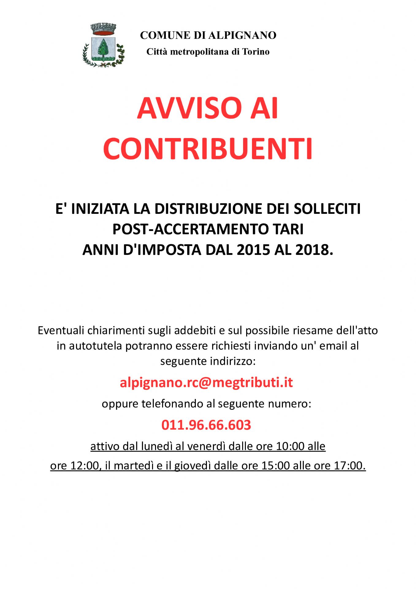 Si informa la cittadinanza che è iniziata la distribuzione dei solleciti POST-ACCERTAMENTO TARI