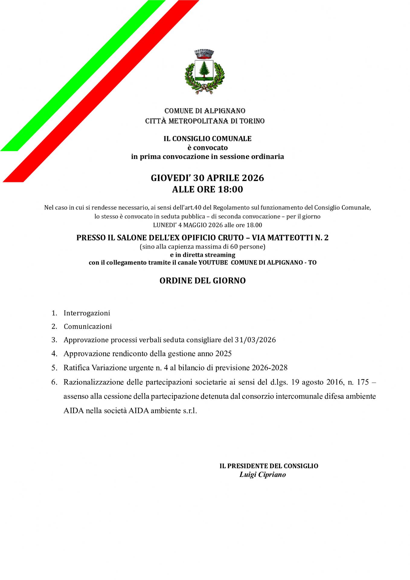 con il collegamento tramite il canale YOUTUBE COMUNE DI ALPIGNANO - TO
