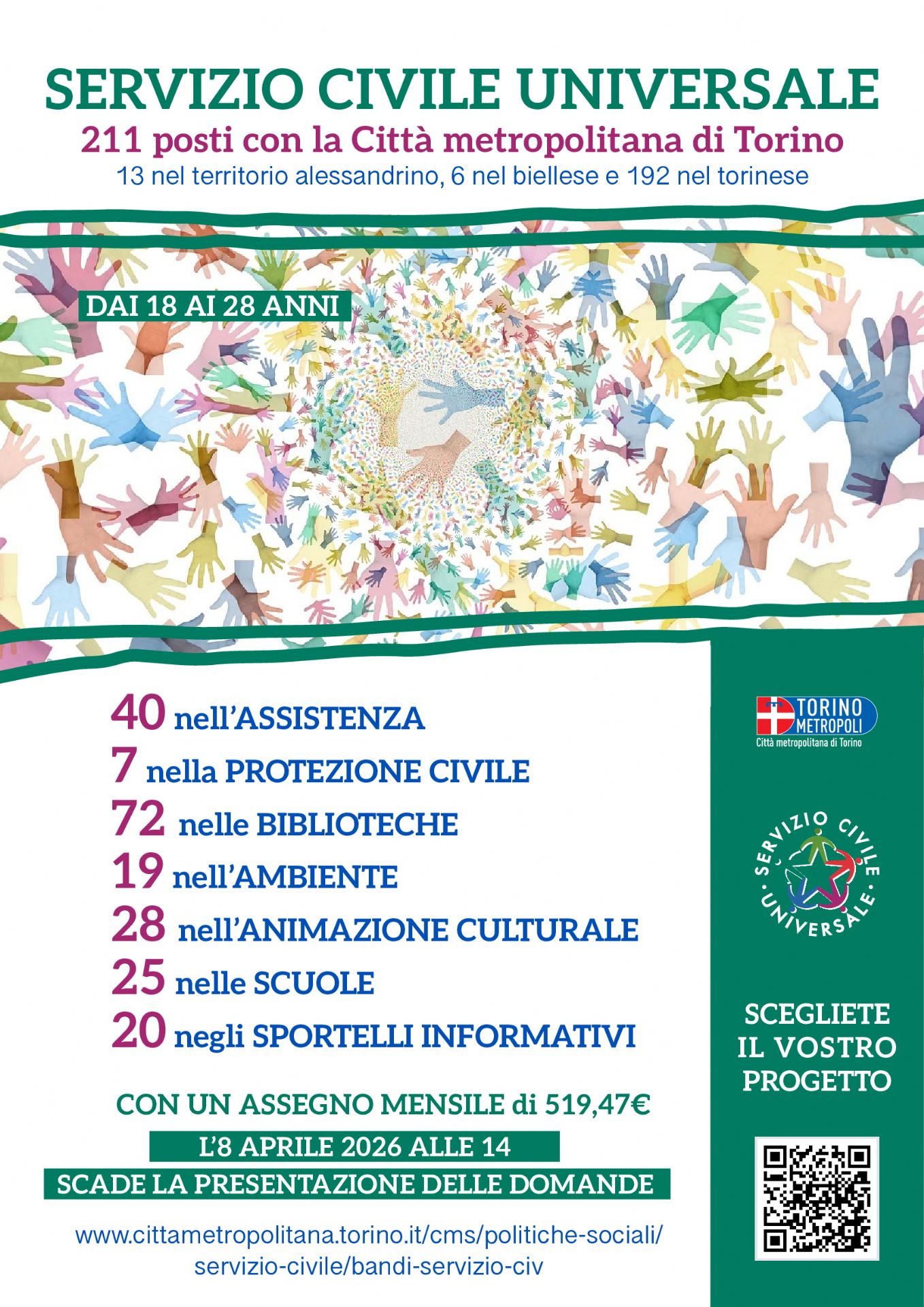 211 giovani (tra i 18 e i 28 anni compiuti) per progetti di Servizio Civile Universale, di cui 75 posti riservati ai Giovani con Minori Opportunità come indicato nelle Schede di sintesi dei progetti.