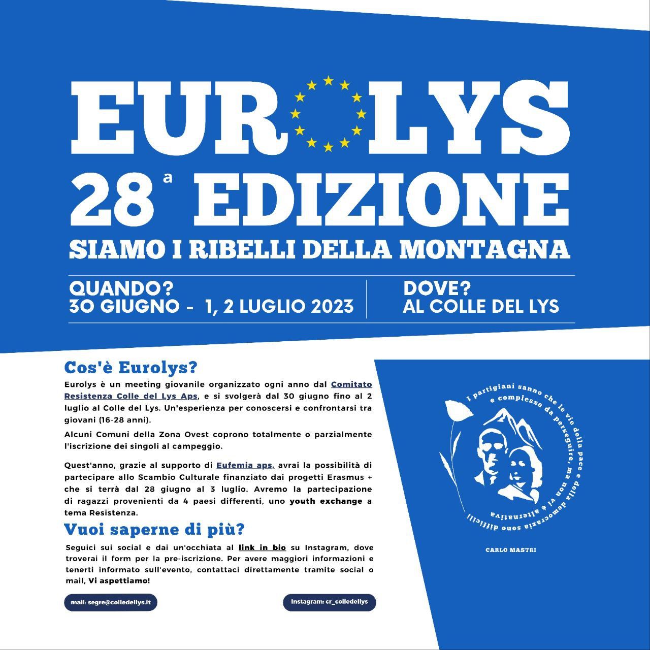 Il meeting, che costituisce un'occasione di incontro e di confronto tra giovani provenienti da tutta Europa sui temi della Resistenza e della liberazione dalle dittature, di valori costituzionali e del senso di "cittadinanza europea", si svolgerà al Colle del Lys dal 30 giugno al 2 luglio 2023.