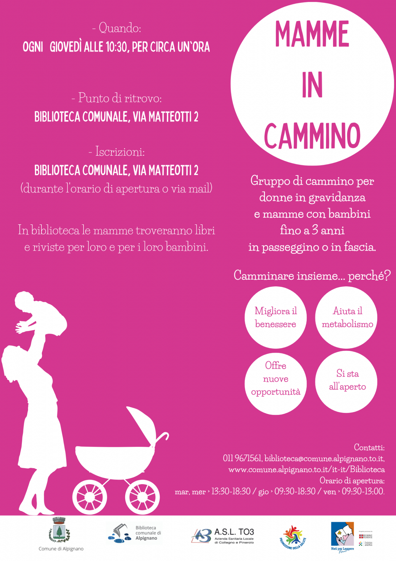 Mamme in cammino, organizzato dalla biblioteca in collaborazione con la Struttura Semplice Promozione della Salute dell'ASLTO3, è un progetto che si pone l'obiettivo di coniugare la promozione della salute della donna e dei bambini con il sostegno alla genitorialità incoraggiando comportamenti favorevoli al benessere fisico e psicologico delle persone.