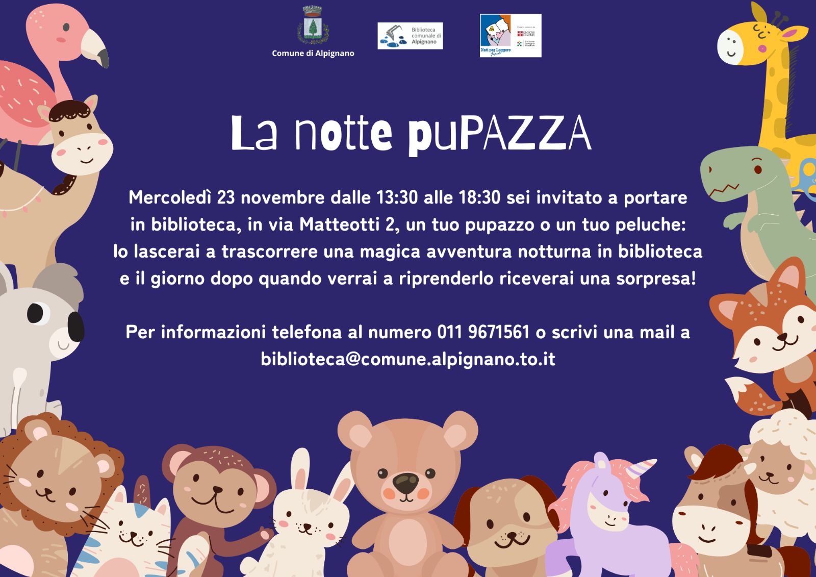- Dalle 13:30 alle 18:30, "La notte puPAZZA": per tutto il pomeriggio i bambini di qualunque età (e anche gli adulti che lo desiderassero), potranno portare un pupazzo in biblioteca e lasciarlo a trascorrere una magica avventura notturna. Il giorno dopo, quando lo riprenderanno, riceveranno una sorpresa. La partecipazione è libera e gratuita.