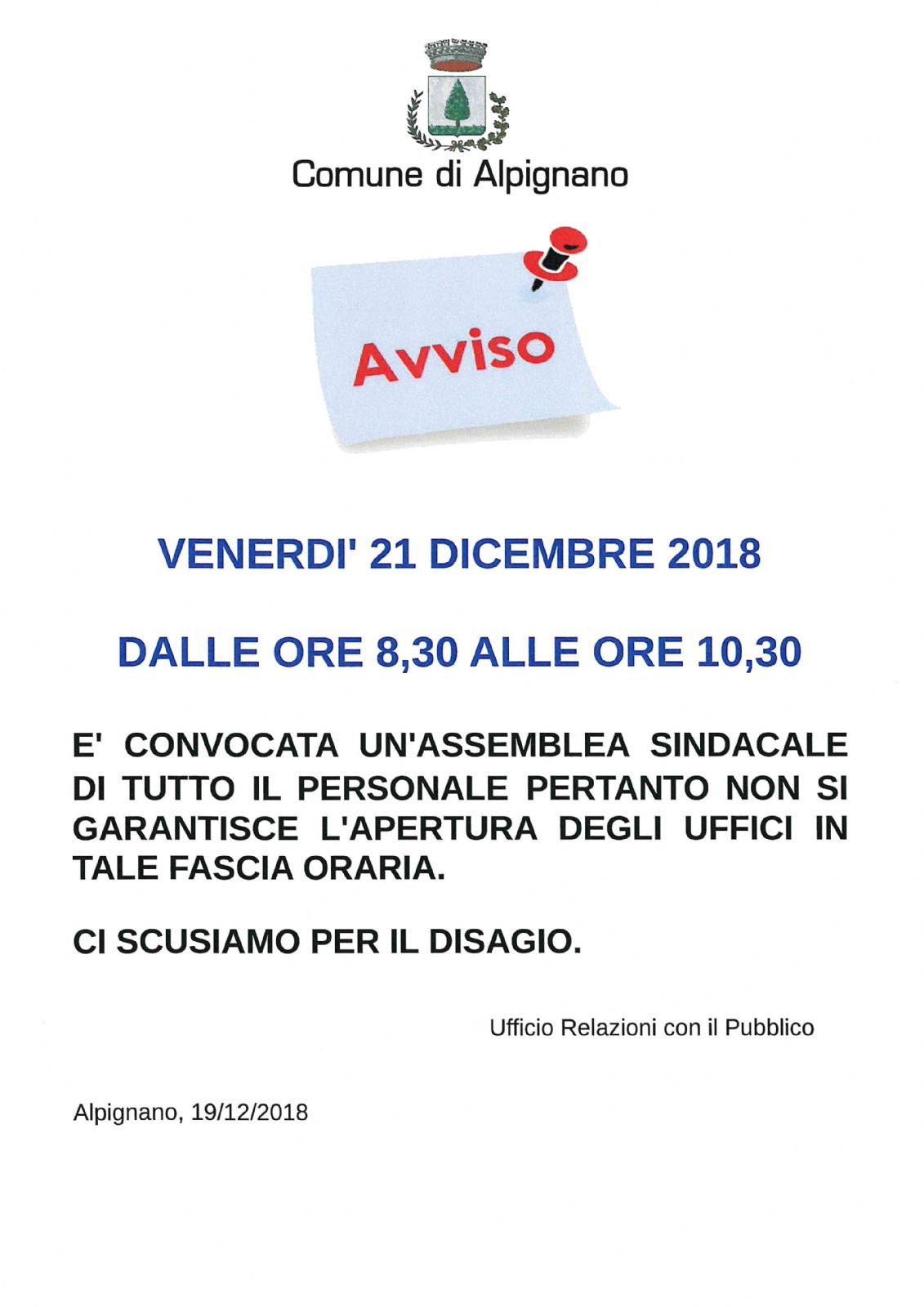 VENERDI' 21 DICEMBRE 2018 DALLE ORE 8,30 ALLE ORE 10,30 E'CONVOCATA UN'ASSEMBLEA SINDACALE DI TUTTO IL PERSONALE PERTANTO NON SI GARANTISCE L'APERTURA DEGLI UFFICI IN TALE FASCIA ORARIA.